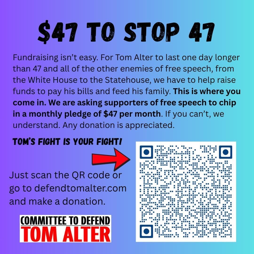 We call on individuals and organizations of conscience everywhere to join our campaign. If Tom Alter can be fired from his job without due process and be denied his constitutionally-protected right to free speech, this can happen to any of us.