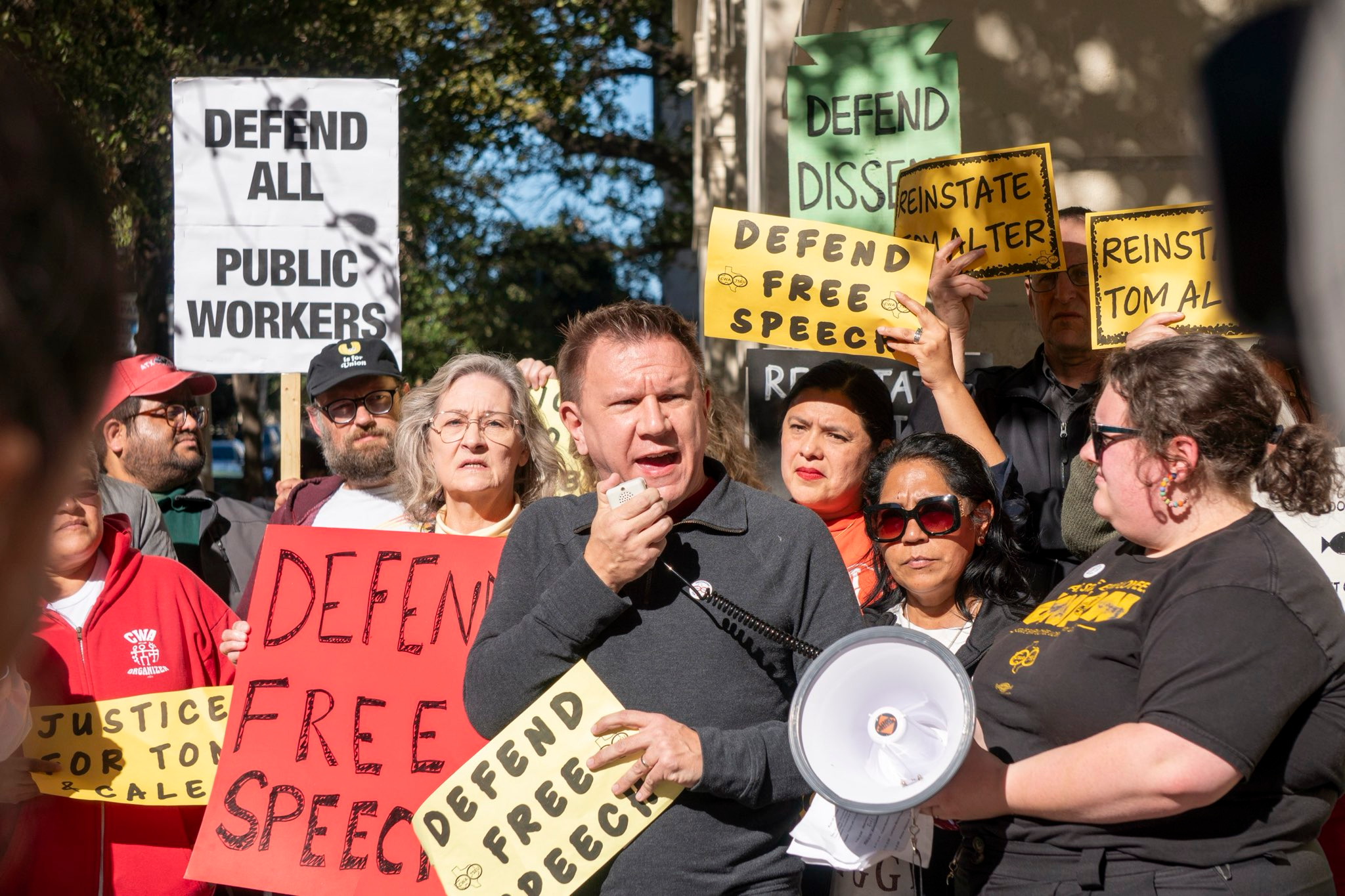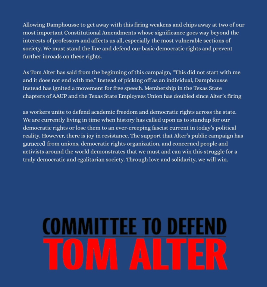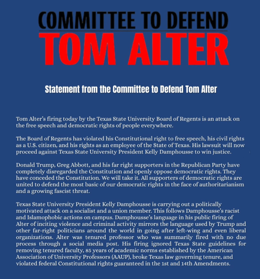 The Committee to Defend Tom Alter demands his immediate reinstatement to his tenured teaching position at Texas State University. We fight for the right of Alter and people everywhere to speak out in support of socialism, the defense of Palestine, LGBTQIA and trans advocacy, anti-racism, and social justice. We are prepared to resist these very real threats by higher education and federal/state government institutions.