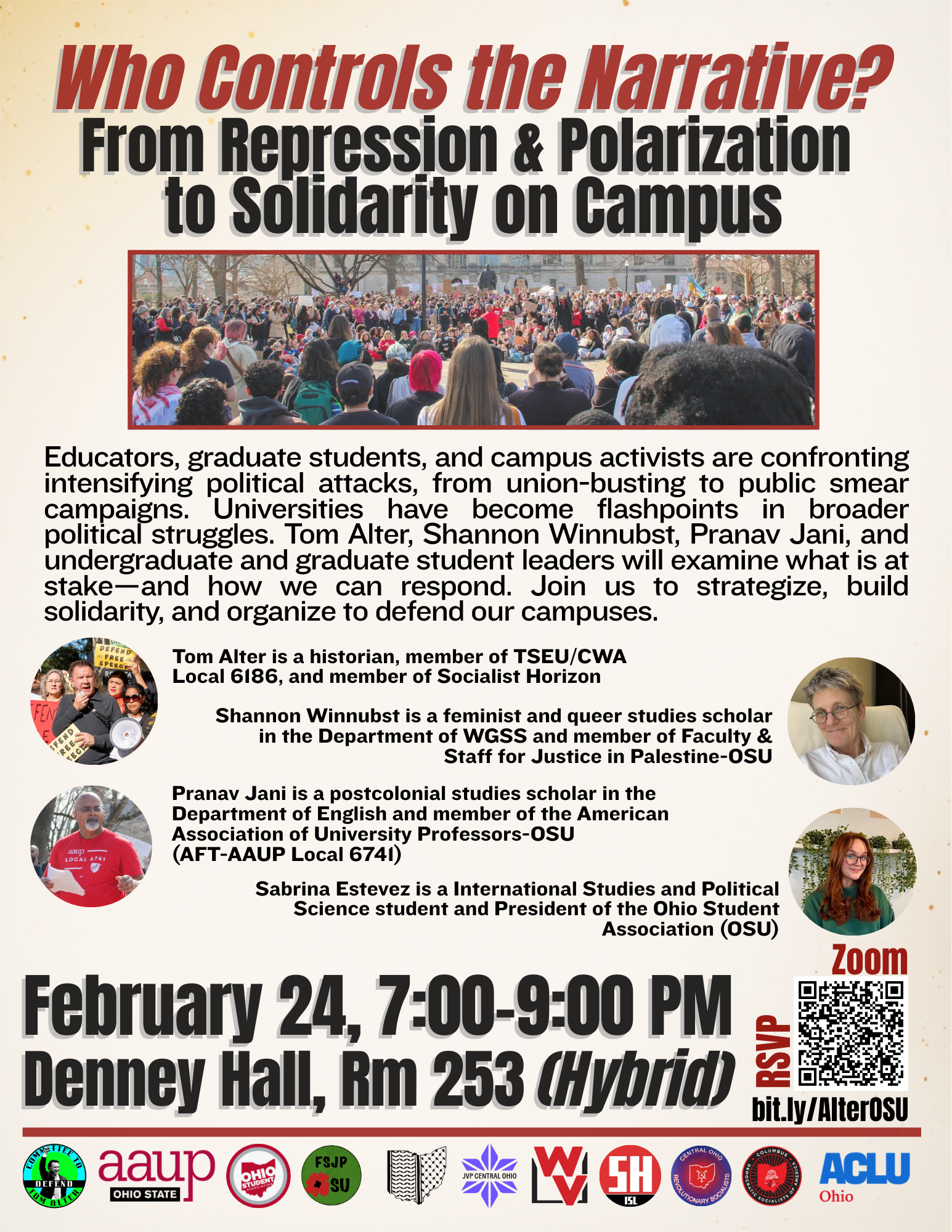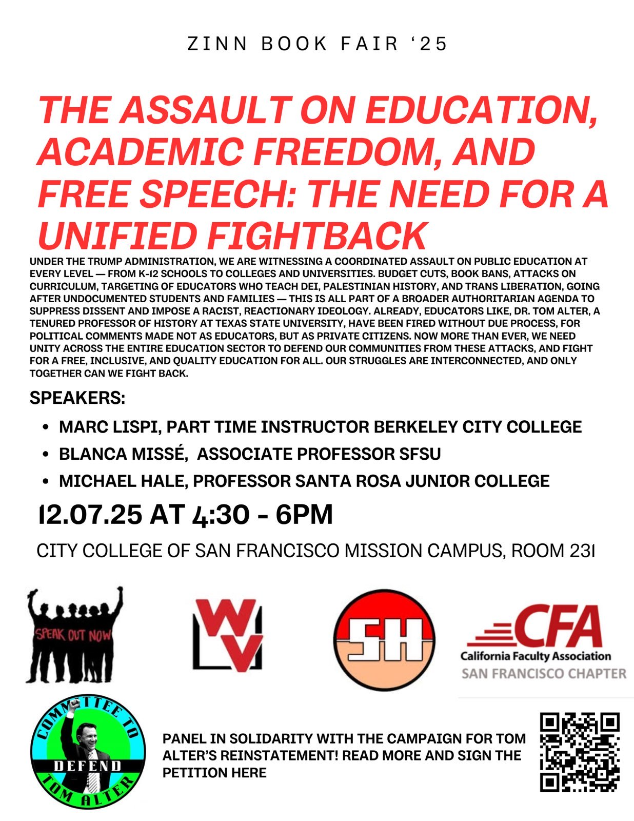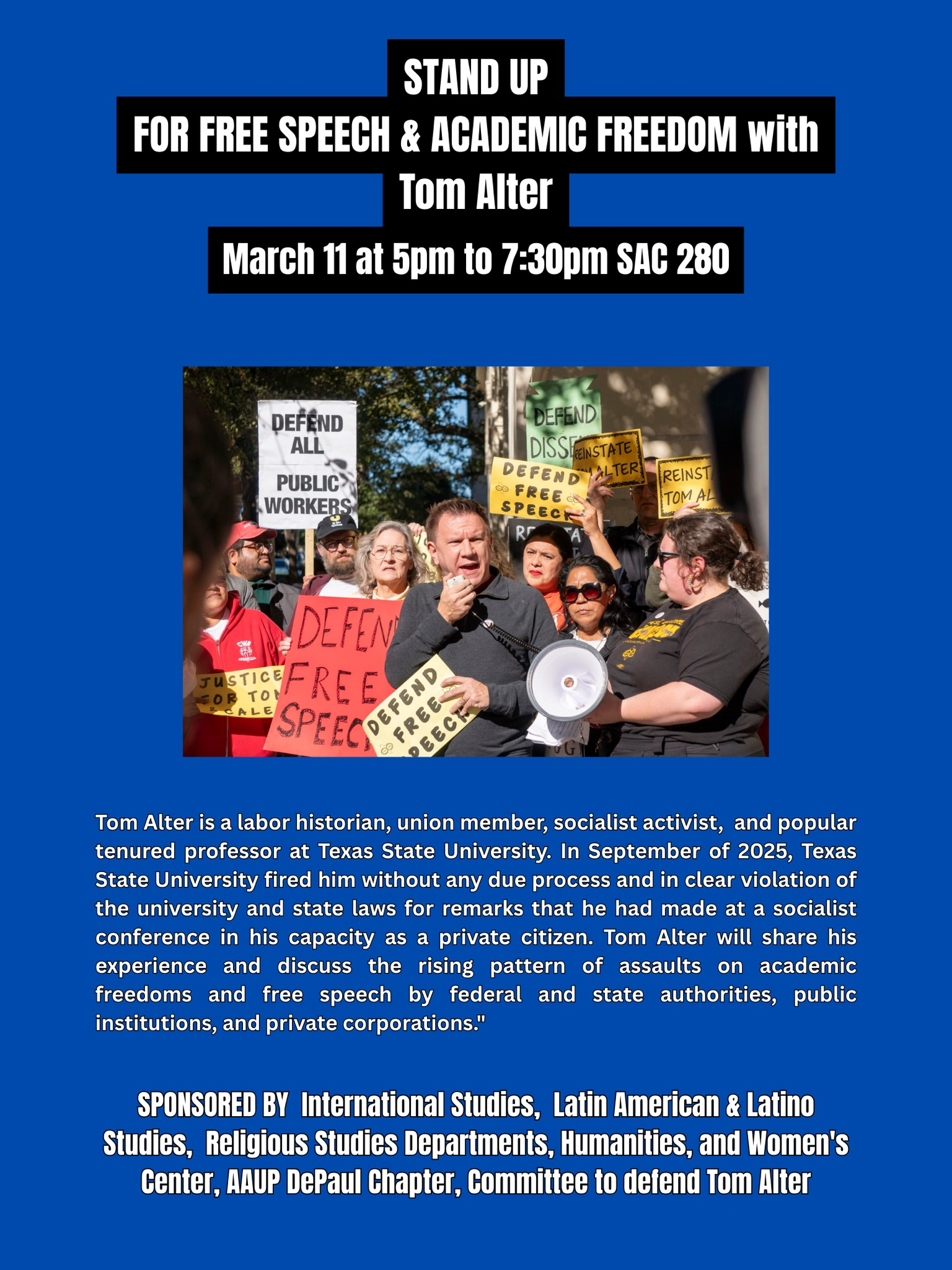 The Committee to Defend Tom Alter demands his immediate reinstatement to his tenured teaching position at Texas State University. We fight for the right of Alter and people everywhere to speak out in support of socialism, the defense of Palestine, LGBTQIA and trans advocacy, anti-racism, and social justice. We are prepared to resist these very real threats by higher education and federal/state government institutions.